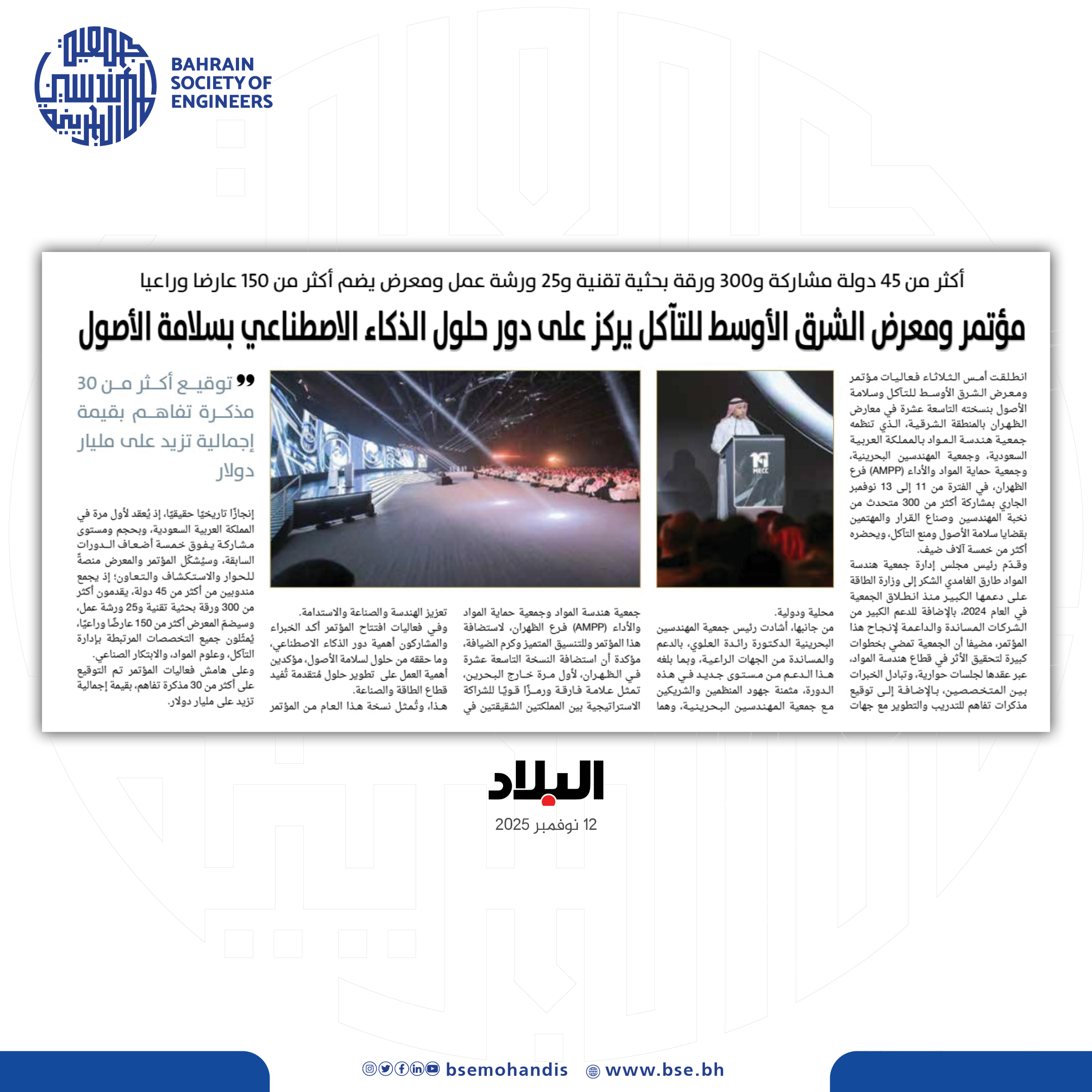 الأربعاء 12 نوفمبر 2025 انطلقت أمس الثلاثاء فعاليات مؤتمر ومعرض الشرق الأوسط للتآكل وسلامة الأصول بنسخته التاسعة عشرة في معارض الظهران بالمنطقة الشرقية، الذي تنظمه جمعية هندسة المواد بالمملكة العربية السعودية، وجمعية المهندسين البحرينية، وجمعية حماية المواد والأداء (AMPP) فرع الظهران، في الفترة من 11 إلى 13 نوفمبر الجاري بمشاركة أكثر من 300 متحدث من […]